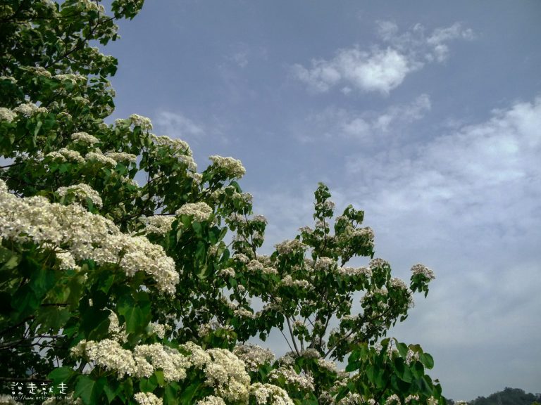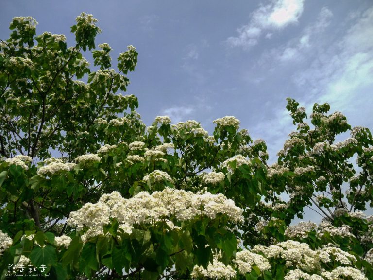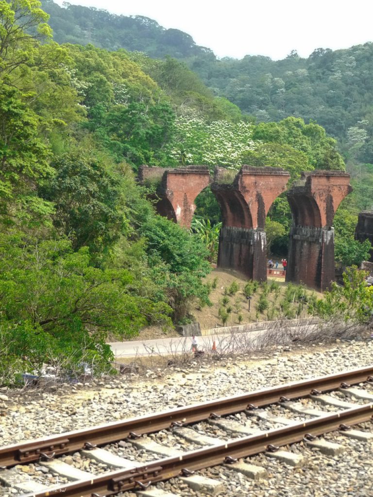 找到一個角度可以拍到鐵軌加斷橋,外加白色點點桐花當背景