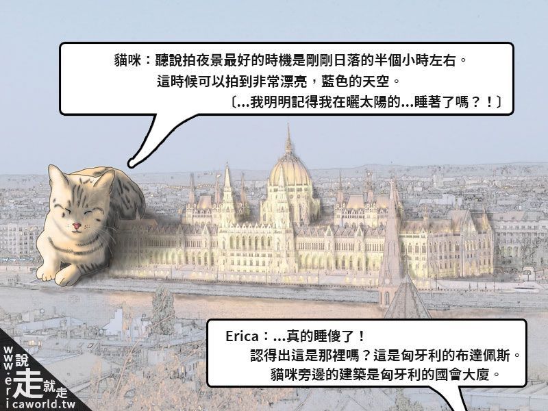 場景的拍攝地點一樣是漁人堡,剛好看到了月昇,因為當時沒有望遠鏡頭所以月亮有比較小顆,不過現場看是覺得又大又圓,所以畫圖的時候自動把她加大了,哈!