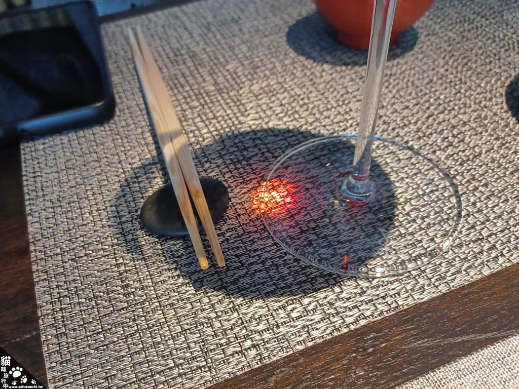 在燈光下,酒透過玻璃投射到桌上感覺像紅寶石一樣。