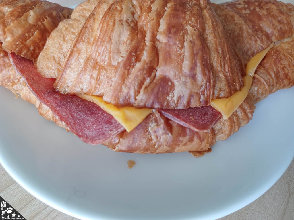 這個牛肉起司可頌是兩小個一份,本來想說會不會吃不飽?因為可頌本身就很有空氣感,而且他的肉片也不是肉排,感覺是像火腿那樣的肉片,結果吃下去居然還是蠻飽的。