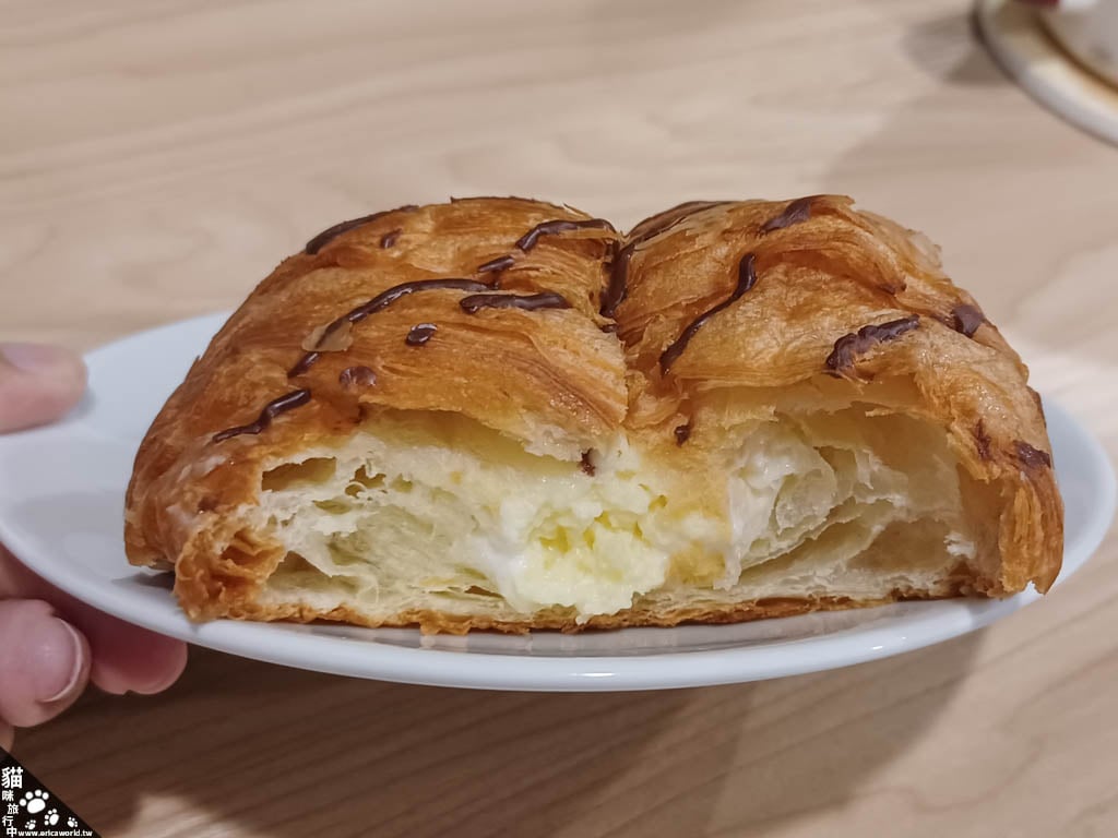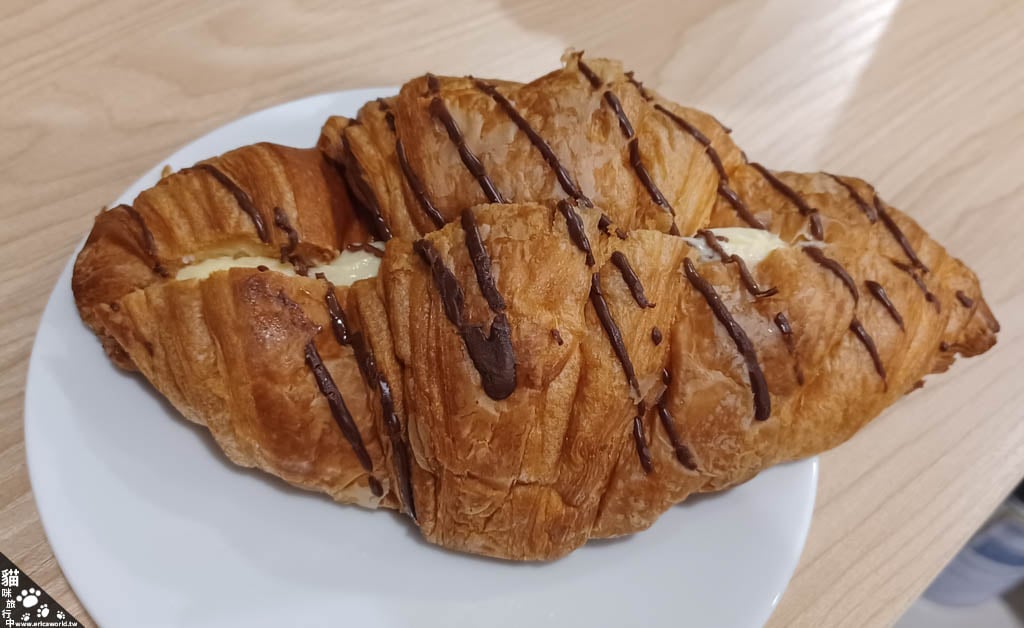 外表還有一點巧克力,內餡我覺得還蠻多的,所以整個吃起來都不會太乾,因為內餡是甜的關係我沒把可頌回烤,所以可頌本身的口感沒那麼好。