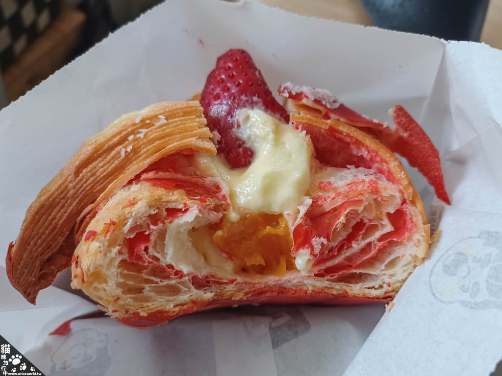 之前我三不五時就會來這家買蛋塔,後來發現好像出了不少新品,像是可頌系列,經過的時候有看到草莓可頌看起來餡料很豐富,但是每次經過想買來吃的時候櫃子上又沒有,有看到的時候又都吃很飽,感覺這個就是買來要現吃才好,好不容易某天早餐時間經過有看到了。