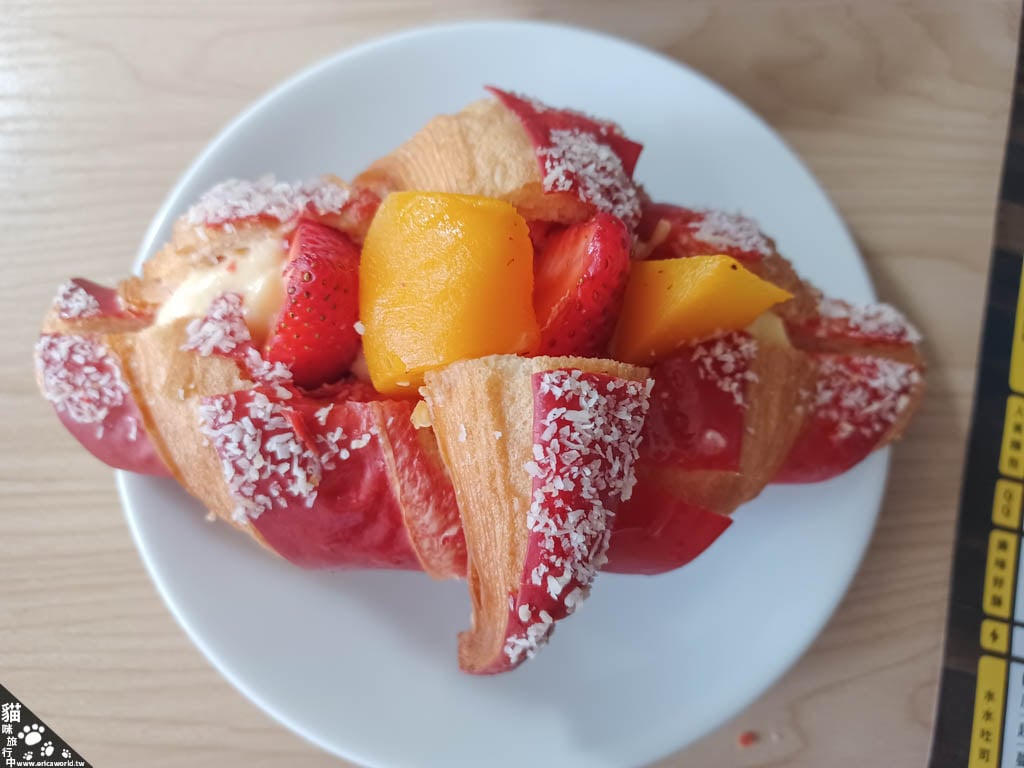 草莓可頌:有新鮮草莓還有水蜜桃罐頭的果肉,還有卡士達醬,餡料很多,外表色彩很豐富外表也有草莓色,上面撒的我分辦不出是什麼。