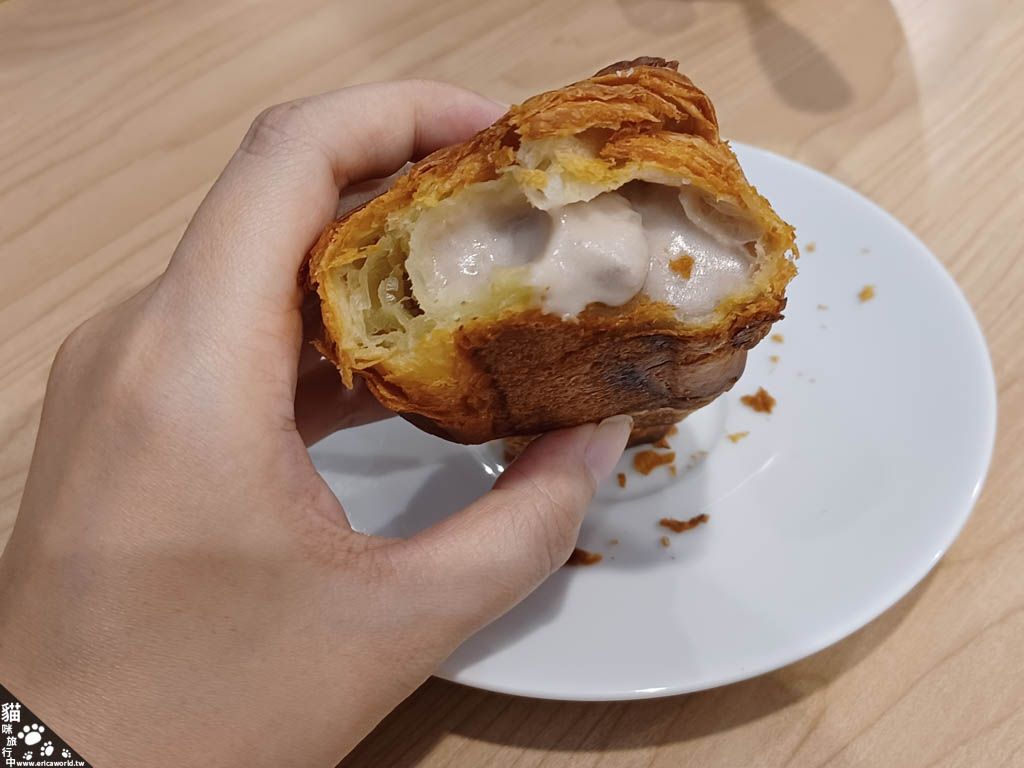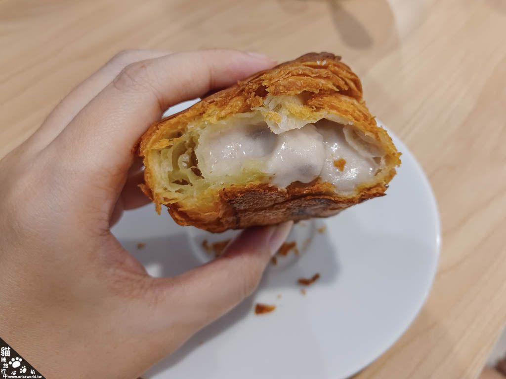 不過,可頌本人的一大問題就是 … 容易到處掉呀 !!!這個芋頭內餡給的也是很大方,整個滿滿的,看起來超過癮,而且不會過甜,真的很不錯。