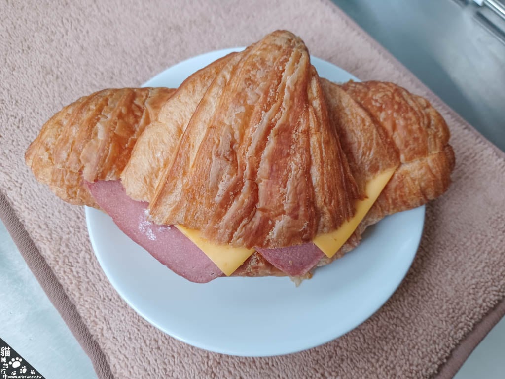 有火腿跟起司片夾在可頌麵包裡,回烤一下可頌外表微酥口感會加分。