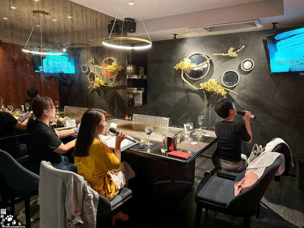 這家法式鐵板燒真的非常特別,基本上都是包廂制〔總共約20個包廂〕,然後還可以唱歌,就是鐵板燒+KTV,而且開到兩點,等於就是吃完可以再唱到飽…不過這幾隻平日去,實在沒體力唱到飽,然後包廂裡都有鐵板,會有師傅進來煮鐵板燒,是說這樣開店成本應該爆高,每個包廂都要一組設備〔包含抽油煙〕,還有就是師傅很忙要跑來跑去〔因為這樣所以師傅都很瘦?〕,是說 … 我搜尋法式鐵板燒特色好像搜不出什麼有用的資訊,不知道法式鐵板燒這個流派有什麼特別之處,總之這家的用餐體驗是非常有趣,包廂內的味道意外的不會太重,而且沒有KTV常會聞到的煙味。